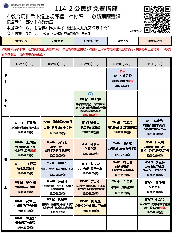 114-2秋季班公民素養週呼應本校辦學願景「形塑綠生活學習圈,以建立永續發展的生態城市」,特別整合「環境永續、綠活創生」、「文化共建、藝術共融」、「弱勢關懷、樂活學習」及「發展具有行動力的實踐社群」四大辦學主軸,規劃橫跨食農教育、永續綠生活、信義慢遊趣、情緒學習與樂活新知等五大主題講座,共計27場次。
