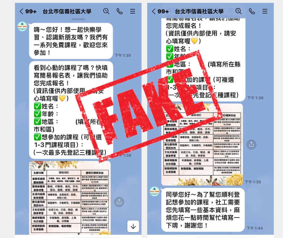 若您收到可疑訊息或廣告,請 勿回覆、勿提供個資,也可立即向信義社大查證。