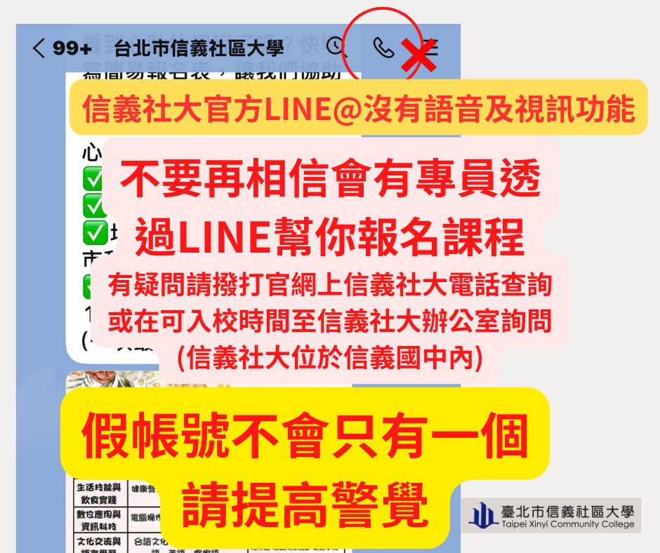 近期有學員反映,接獲不明來源的詐騙訊息,有人假冒信義社區大學名義,在 FB和LINE 上宣稱開課、拉群組、索取個資或要求私下聯繫與匯款。請大家務必提高警覺!